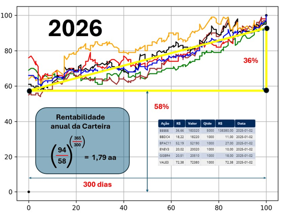 Pense nisto! São cinco grupos de ações representadas por curvas indicando o comportamento em 300 dias. As curvas mais baixas são de menor risco e de maior alavancagem na alta. Bastam 3 a 5 papéis.